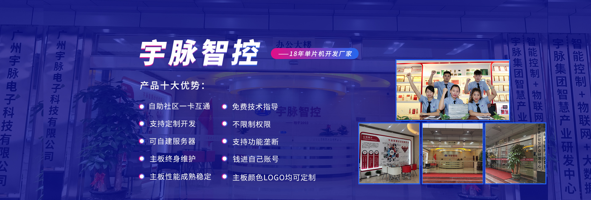 公司前身是2003年成立的宇脈電子石牌經營部,在廣州新賽格電子城擁有兩個實體店,專注于單片機開發、電子產品定制開發。2014年正式更名為廣州宇脈電子科技有限公司,專注打造無人值守自助設備控制系統及后臺管理系統方案定制的國家高新技術企業。并成為集研發、生產、銷售和服務于一體的領軍企業。